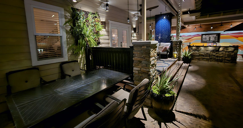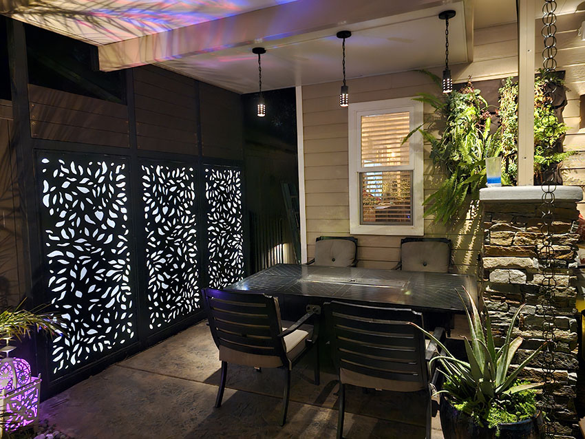 We built a custom patio cover, creating a cozy and inviting dining area perfect for entertaining or relaxing. The space is illuminated by ambient lighting, setting a warm and welcoming mood. As a focal point, we installed a large, decorative light panel, measuring 8 feet by 12 feet, adding a unique artistic touch. Lush greenery cascades down the walls, bringing life and color to the space.